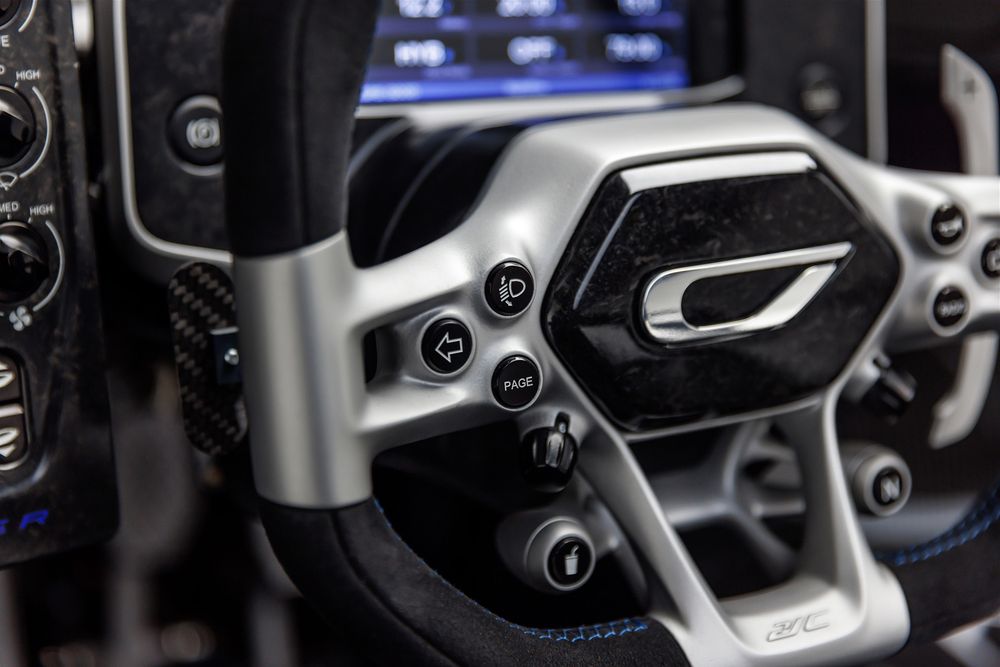 The 21C’s hybrid powertrain uses the world’s most power dense production IC engine as its foundation. It is a 2.88 liter, flat-plane crank V8 with twin turbos located mid-vehicle. The V8 is coupled with an 800V electric drive and regen system. An e-motor drives each front wheel and the batteries are charged during operation both through regenerative braking and a Motor Generator Unit (MGU) using a gear drive that is attached to the IC engine. The total strong hybrid system delivers a peak output of 1250hp (1233bhp).