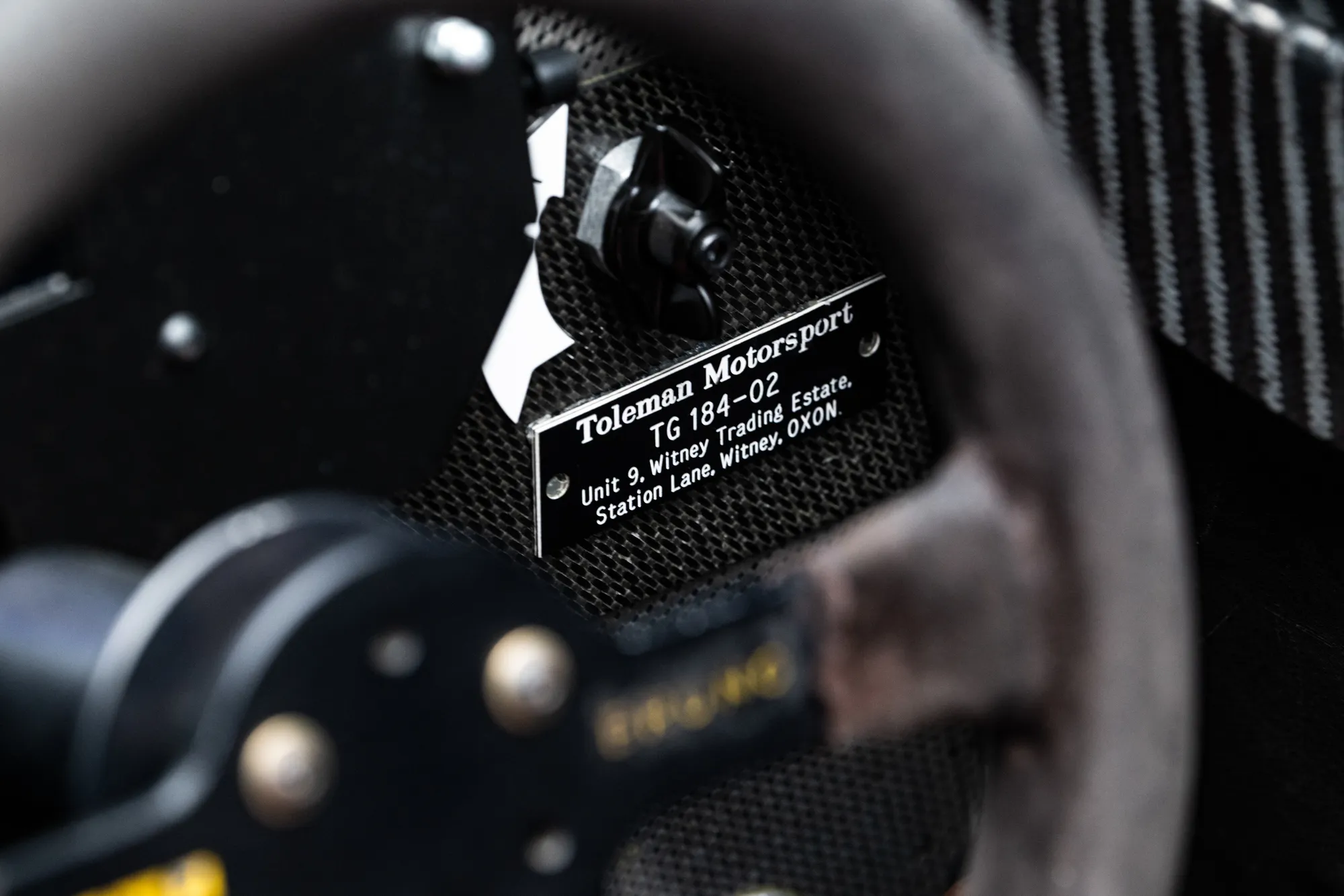 The TG184 uses a carbon‑fibre honeycomb monocoque that evolves the TG183B tub, with re‑laminated bulkhead areas to increase stiffness and improve component packaging. Wheelbase is approximately 2,800 mm, with a 1,765 mm front track and 1,676 mm rear track, giving a neutral footprint suited to the car’s medium and low‑speed focus. Longer sidepods house vertically mounted radiators and intercoolers with louvered upper exits, freeing the nose for a conventional one‑piece front wing and improving cooling margins for the Hart turbo installation. Underbody work centers on flat‑floor sealing via kicked‑up pod bottoms and fence elements ahead of the rear wheels to stabilize flow into the diffuser within the short wheelbase constraints. Carbon‑kevlar body panels and simplified cooling hardware reduce mass, allowing operation close to the minimum weight despite turbo and intercooler hardware.