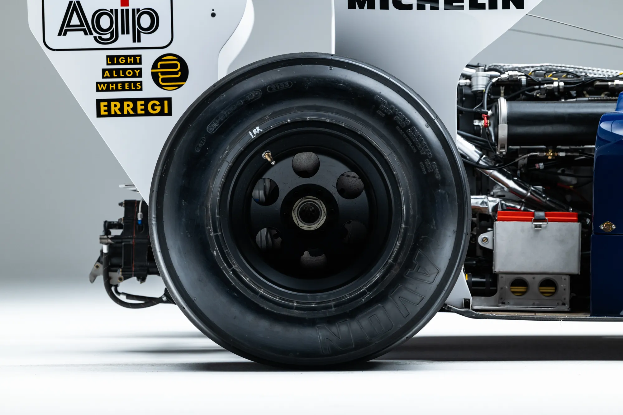 Power comes from the Hart 415T, a 1,459 cc turbocharged inline‑four mounted longitudinally as a stressed member behind the monocoque. Contemporary figures indicate approximately 600–650 hp in race trim, with up to around 750 hp available in qualifying with increased boost within pop‑off valve limits. Fuel is Agip, with relatively simple electronic strategies for boost and ignition management to balance performance against the 220‑liter race fuel allocation. The gearbox is a longitudinal Hewland five‑speed manual directly mated to the engine, with ratios frequently adjusted to keep the turbo in its effective boost range. Suspension uses double wishbones with pull‑rod actuation at the front and push‑rod at the rear, inboard coil‑over dampers, adjustable anti‑roll bars, ventilated disc brakes with period carbon options, and 1984‑season Michelin tyres following an early switch from Pirelli.