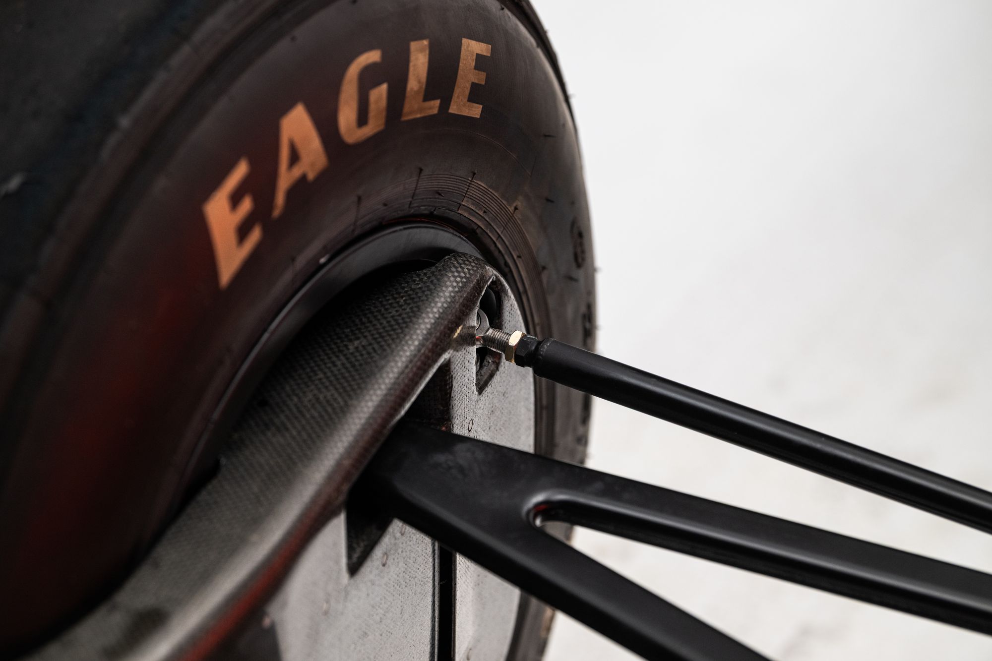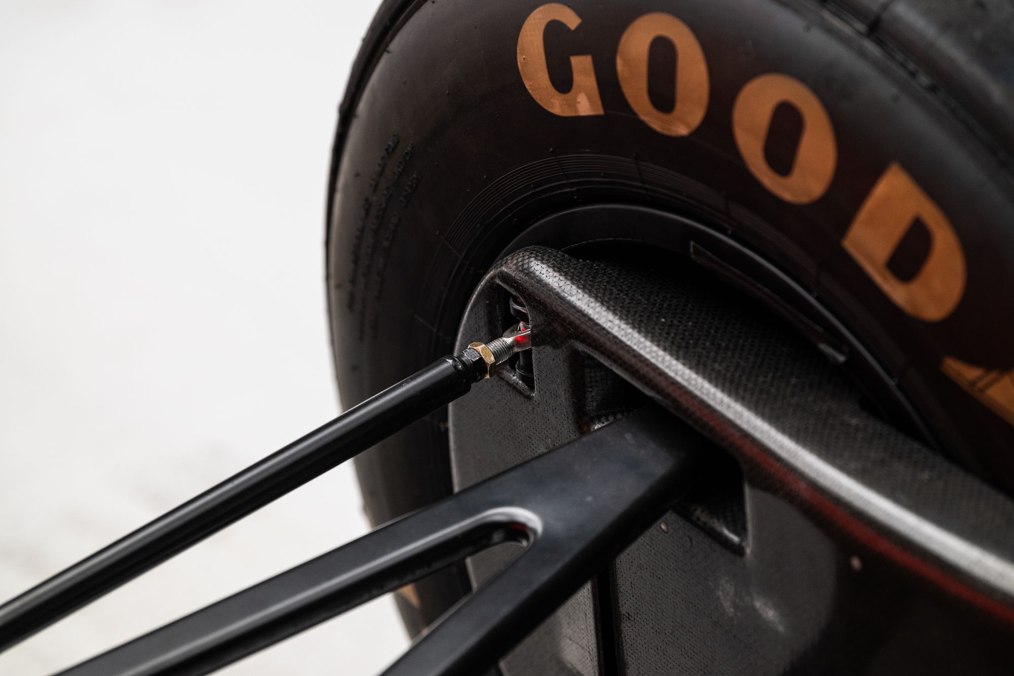 In period specification, the MP4‑3B combined McLaren International/Hercules carbon‑fibre monocoque construction with honeycomb cores and a one‑piece carbon upper body section, using rack‑and‑pinion steering and double‑wishbone pushrod suspension with Showa gas/oil dampers. Braking was by Carbone Industrie carbon discs with twin master cylinders, working through Dymag 13‑inch magnesium wheels (11.75 inches wide at the front and 16.5 inches at the rear) shod in Goodyear Eagle tyres. Minimum weight was approximately 540 kg under the 1988 turbo regulations.